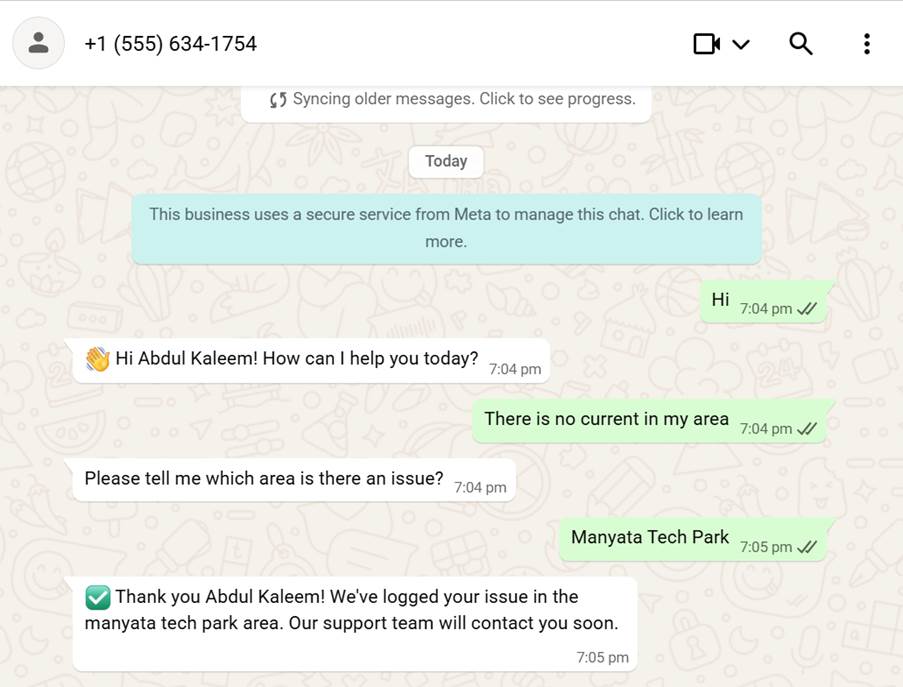 "reply": "✅ Thank you John! We've logged your issue in the bangalore area. Our support team will contact you soon.",