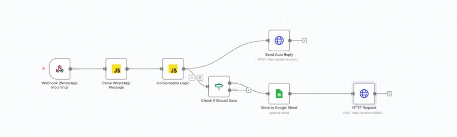The workflow begins with a WhatsApp conversation. The bot greets the user and asks: